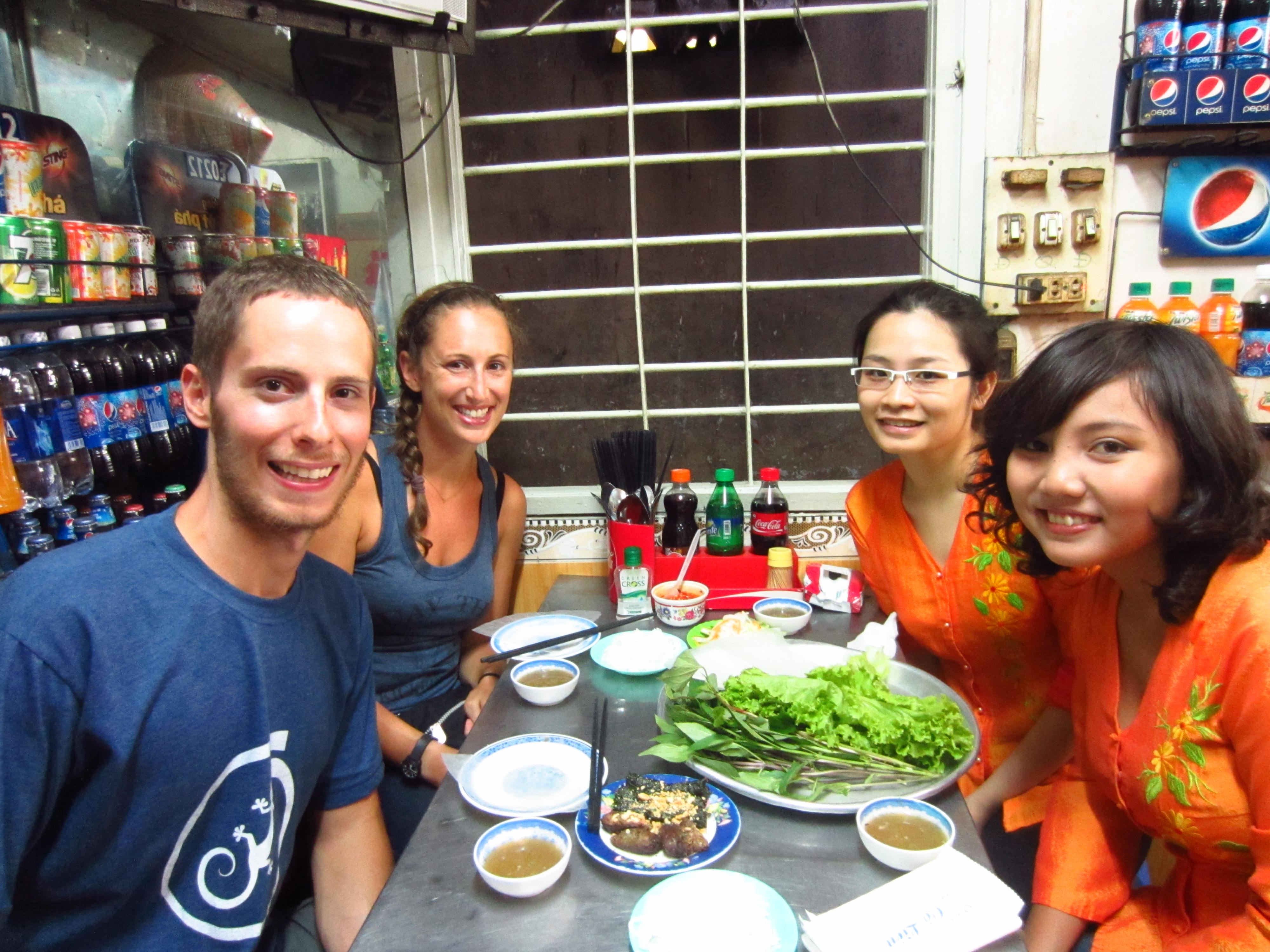 On our second night here, we went on a night tour of Saigon on the back of motorbikes driven by local college girls. While this was an organized tour, you should know that that traffic in Saigon is borderline chaos. Motorbikes are the preferred mode of transportation and rule the road. It is quite uncommon for families to own cars, while most children get their start on a motorbike in their early teens. The streets are extremely crowded with bikes and the traffic is insanely busy. We haven’t figured out how the flow of traffic works, as we don’t really see anyone stopping on reds or going on greens but for some reason the traffic flows very smoothly. Crossing the street is a game in itself, there are crosswalks but the motorbikes do not stop at them. The rule of thumb for crossing the street is to step off the curb, move methodically and steadily across the street, never ever stop and pray that the traffic will veer around you. In almost every case, it does! With that being said, getting on the back of a motorbike was crazy. We sped throughout the city, in and out of different districts and markets as well as stops for dinner and dessert. Not only was it great viewing the city from a bike, but we also were able to have candid conversations with college kids. Both of our drivers were fluent in English and majoring in Tourism and Interpretation, and had a strong interest to visit the States.